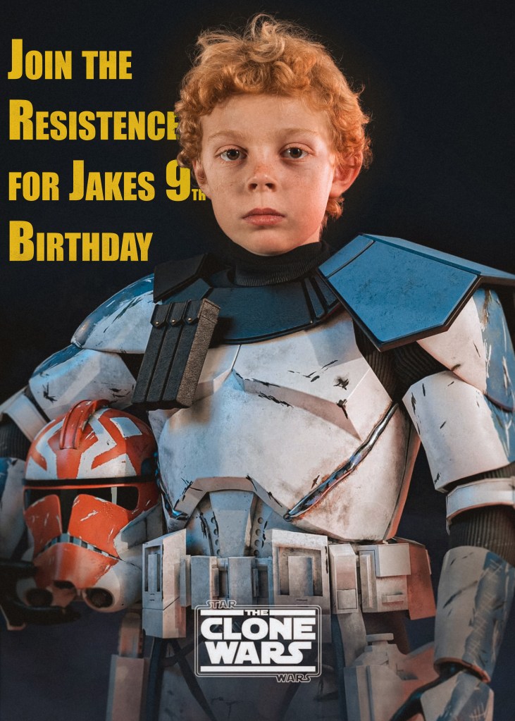 Older brother finally got his chance! With Covid and his choice to go to Lego Land instead of a party he missed out on photo edits for a few years. This one was tricky with his desire to be a very specific character from Star Wars. A character that has only been seen in cartoons and is usually wearing a helmet how was I gonna pull this off!? Well I figured the best I could do was photoshop his head onto an existing photo. Thankfully I found this perfect image that’s actually a 3D render of the character. Contacted the creator and he was kind enough to let me use the photo! Once again used a mom sweater for the neck and it worked perfectly!