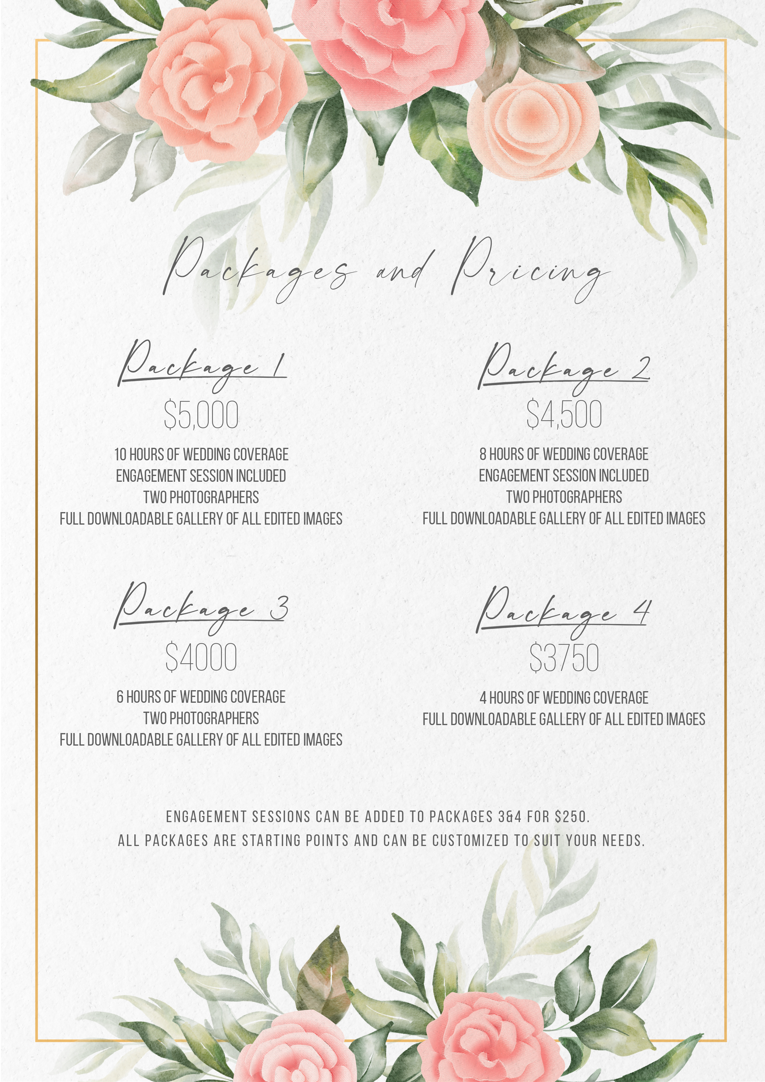 *All pricing includes rights to all pictures delivered: there are no additional fees to obtain your pictures, we simply ask that when sharing and publishing, you give credit to Jeff Armstrong Photography. Travel fees may apply based on event location.